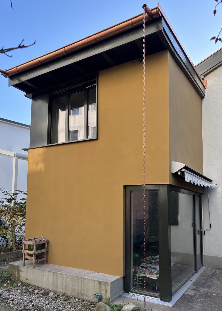 Das kleine Wohnhaus gehört zu einem Strassenensemble aus Arbeiterhäusern erbaut ca. 1900 vom Architekten Rudolf Linder. Im Jahre 1994 wurde gartenseitig ein zweigeschossiger Anbau gesetzt, das Erdgeschoss mit dem Einbau von Schiebetüren geöffnet sowie Bäder und Küche saniert. Nach 30 Jahren waren diese Baumassnahmen teilweise stark beschädigt, in der Gestaltung aber nach wie vor sehr stimmig. Ein Ersatz der Küche, die Energetische Ertüchtigung und Sanierung von Anbau und Dach sowie diverse kleinere Sanierungen wurden notwendig. Dabei sollte sowohl den energetischen wie auch den gestalterischen Ansprüchen Rechnung getragen werden. Zudem mussten die Umbaumassnahmen im bewohnten Zustand stattfinden.